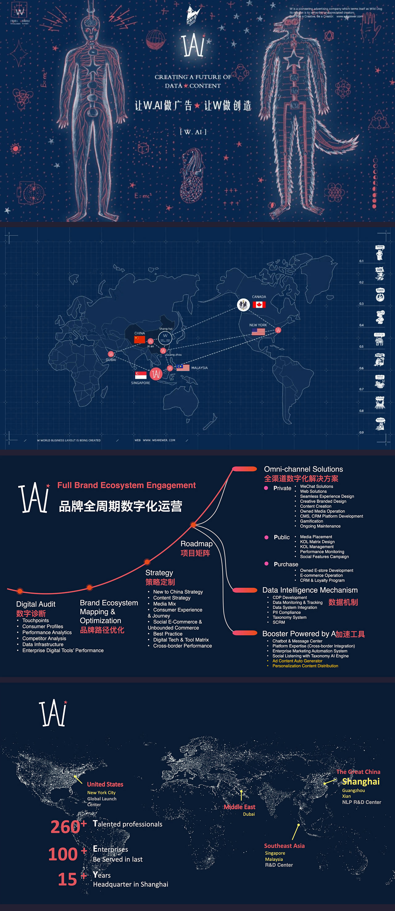 本土業務方面,持續合作大眾點評,豆瓣網,墨跡天氣,騰訊集團,中國銀聯,浦發銀行,網易遊戲,Bilibili,錢包金服,天貓,西貝,首草集團等國內品牌,特別如同樣2014年合作至今的大眾點評,以及在中國創立多年,影響力巨大的豆瓣網和墨跡天氣,首度打造品牌形象就首選W合作,W同樣持續為其創造傳播模式先例與數據記錄,為上述品牌量身打造的作品,目前都被奉為行業經典和範例。面對國際國內客戶,W最終都用享譽度和影響力極高的作品,在市場反響和國際獎項上不斷獲得實質認可。